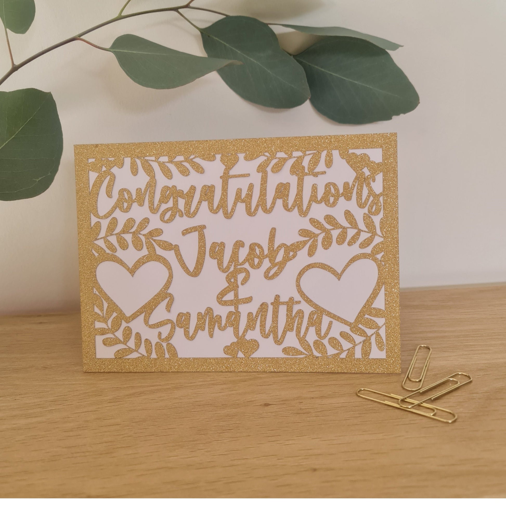 Celebrate a special couple with this beautifully crafted personalised wedding or engagement card. Featuring an elegant papercut design with two large hearts, this card can be customised with the couple’s names and, optionally, their special month and year.