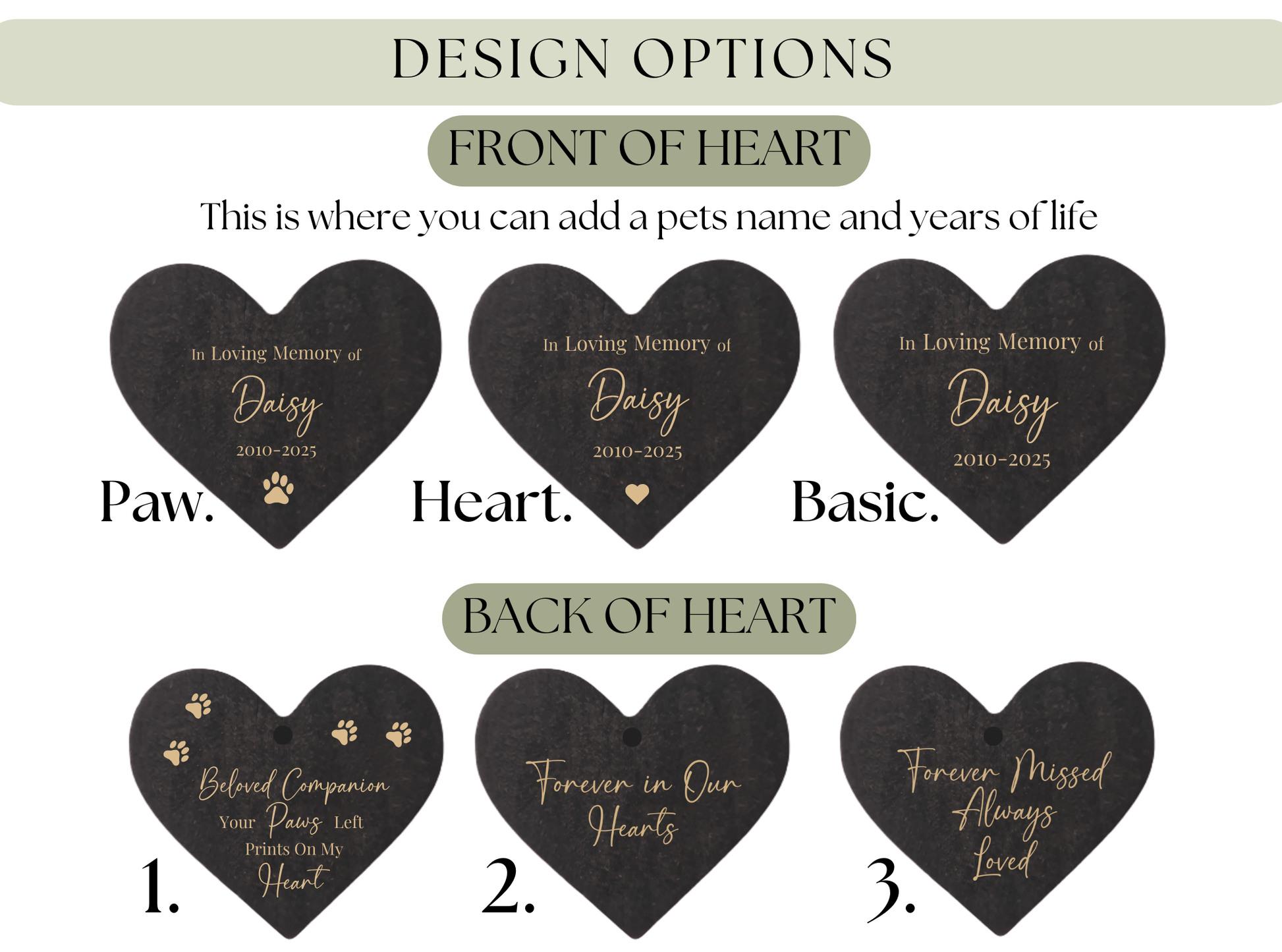 Laser engraved on both sides of the heart and sealed for outdoor use