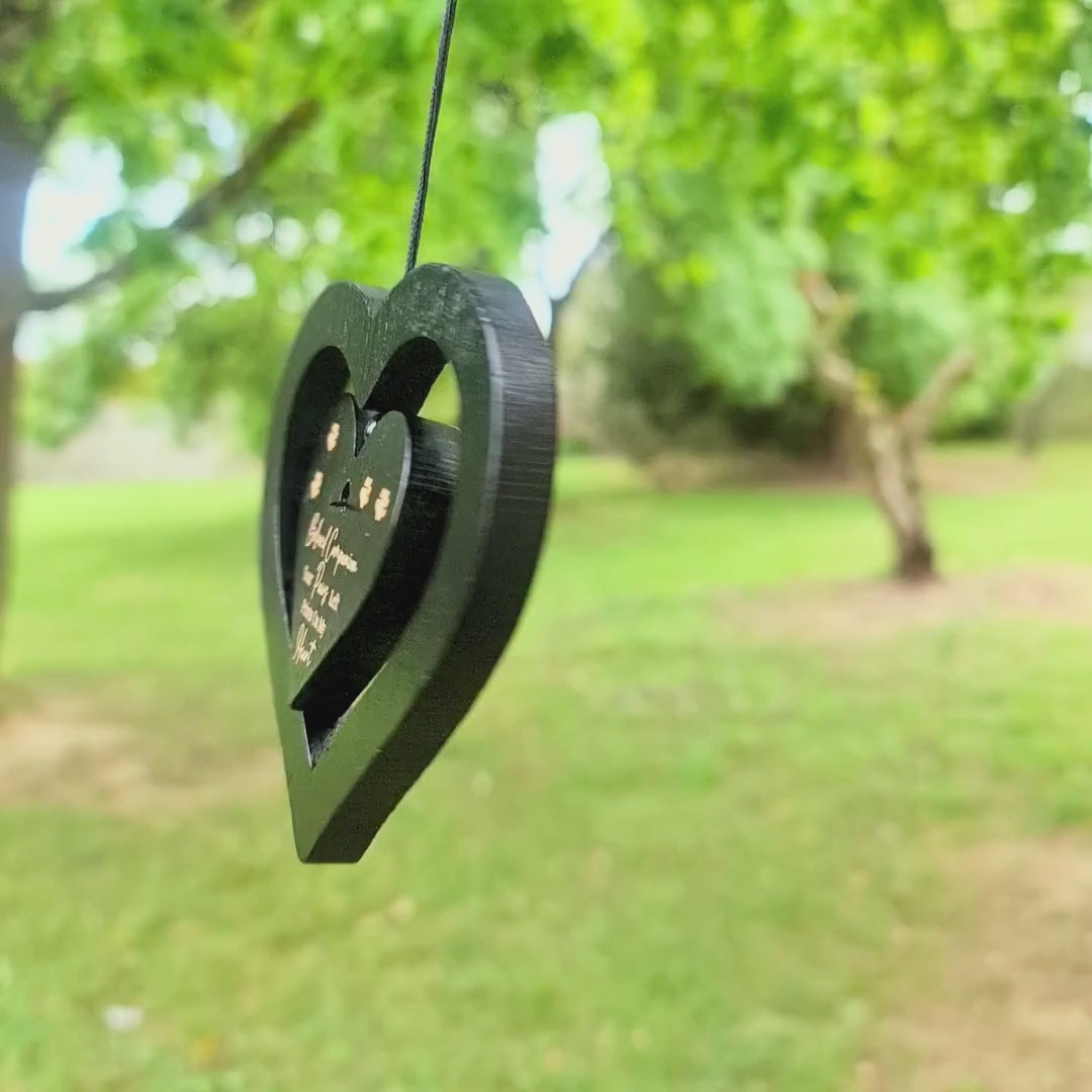 Our Pet Memorial Wind Chimes feature a unique spinning heart design, with a rotating centerpiece engraved with your personalized message. Thoughtfully crafted to honor the life of a beloved companion, this keepsake offers a gentle reminder of the unconditional love and joy they brought into your life.